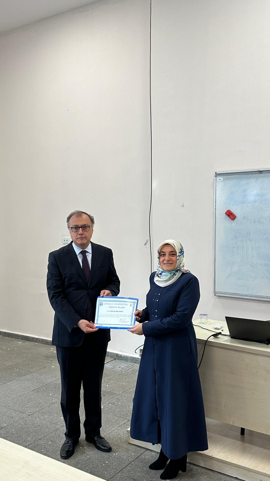 Etkinliğin sonunda, Sayın Dekanımız Prof. Dr. Muharrem AKOĞLU, katkılarından dolayı Dr. Öğr. Üyesi Tuğba VELİOĞLU’na teşekkür belgesi takdim etti. Program, akademisyenler ve öğrencilerle birlikte çekilen hatıra fotoğrafı ile sona erdi.