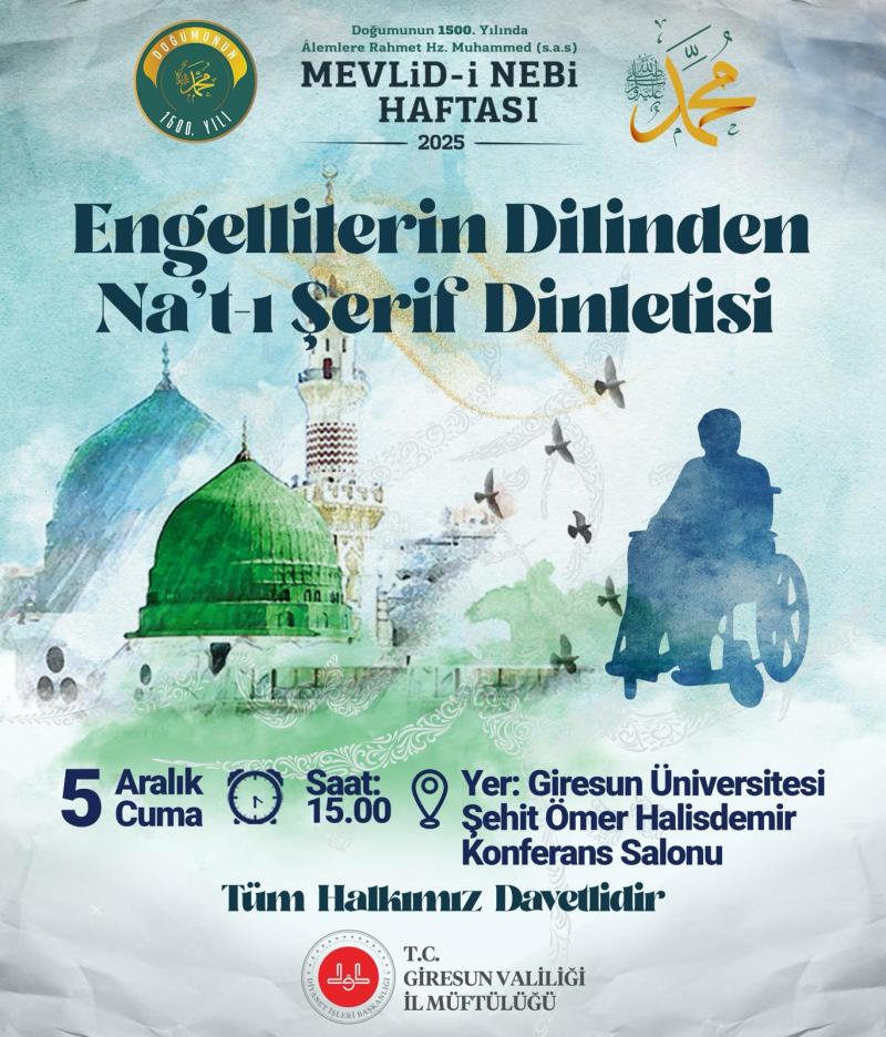 Giresun Valiliği İl Müftülüğü tarafından, Mevlid-i Nebi Haftası 2025 etkinlikleri kapsamında “Engellilerin Dilinden Na‘t-ı Şerif Dinletisi” programı düzenlenecektir. Hz. Peygamberimizin (s.a.s.) doğumunun 1500. yılı vesilesiyle gerçekleştirilecek bu anlamlı programda, engelli bireylerimizin seslendireceği na‘t-ı şeriflerle Efendimize duyulan sevgi ve muhabbet paylaşılacaktır.