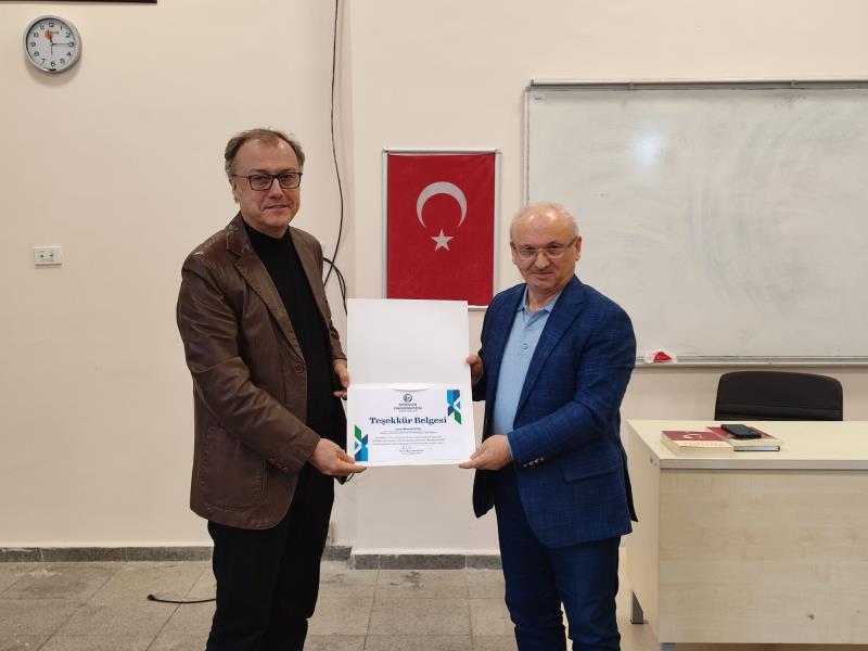 Öğrenciler tarafından ilgiyle takip edilen programın sonunda, Fakültemiz Dekanı Prof. Dr. Muharrem AKOĞLU, katkılarından dolayı Mehmet FATSA’ya teşekkür belgesi takdim etti.