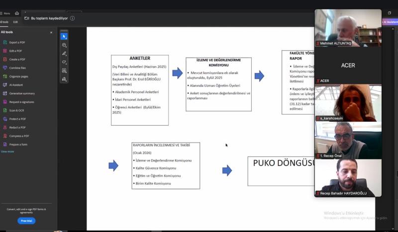 Toplantı kapsamında fakültenin komisyon başkanları da kendi birimlerine ilişkin bilgi paylaşımında bulunarak yürütülen çalışmalar, mevcut durum analizi ve ihtiyaç duyulan iyileştirme alanları hakkında değerlendirmeler yaptı. Bu çerçevede süreç boyunca elde edilen kazanımlar, karşılaşılan zorluklar ve geleceğe yönelik planlamalar ayrıntılı biçimde ele alındı. Toplantı boyunca öğrenci merkezli öğrenme yaklaşımları, program çıktılarının izlenmesi, ölçme-değerlendirme süreçleri, kurumsal işleyişin iyileştirilmesi ve sürdürülebilir kalite yönetimi gibi konular üzerinde duruldu. Ayrıca akreditasyon sürecinde dikkat edilmesi gereken iyi uygulama örnekleri, fakültenin güçlü yönleri ve geliştirilmesi gereken yönlere dair tavsiyeler de toplantının önemli başlıkları arasında yer aldı.