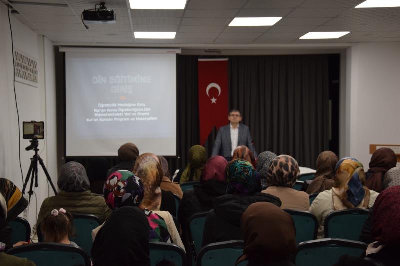 Doç. Dr. ALGUR, sunumunda “Kur’an-ı Kerim öğretim yöntem ve teknikleri” ile “sınıf yönetimi” konularında kapsamlı değerlendirmelerde bulunarak öğreticilere pratik yaklaşımlar, sınıf içi iletişimi güçlendiren uygulamalar ve öğrenme sürecini destekleyen pedagojik ilkeler üzerine öneriler sundu.
