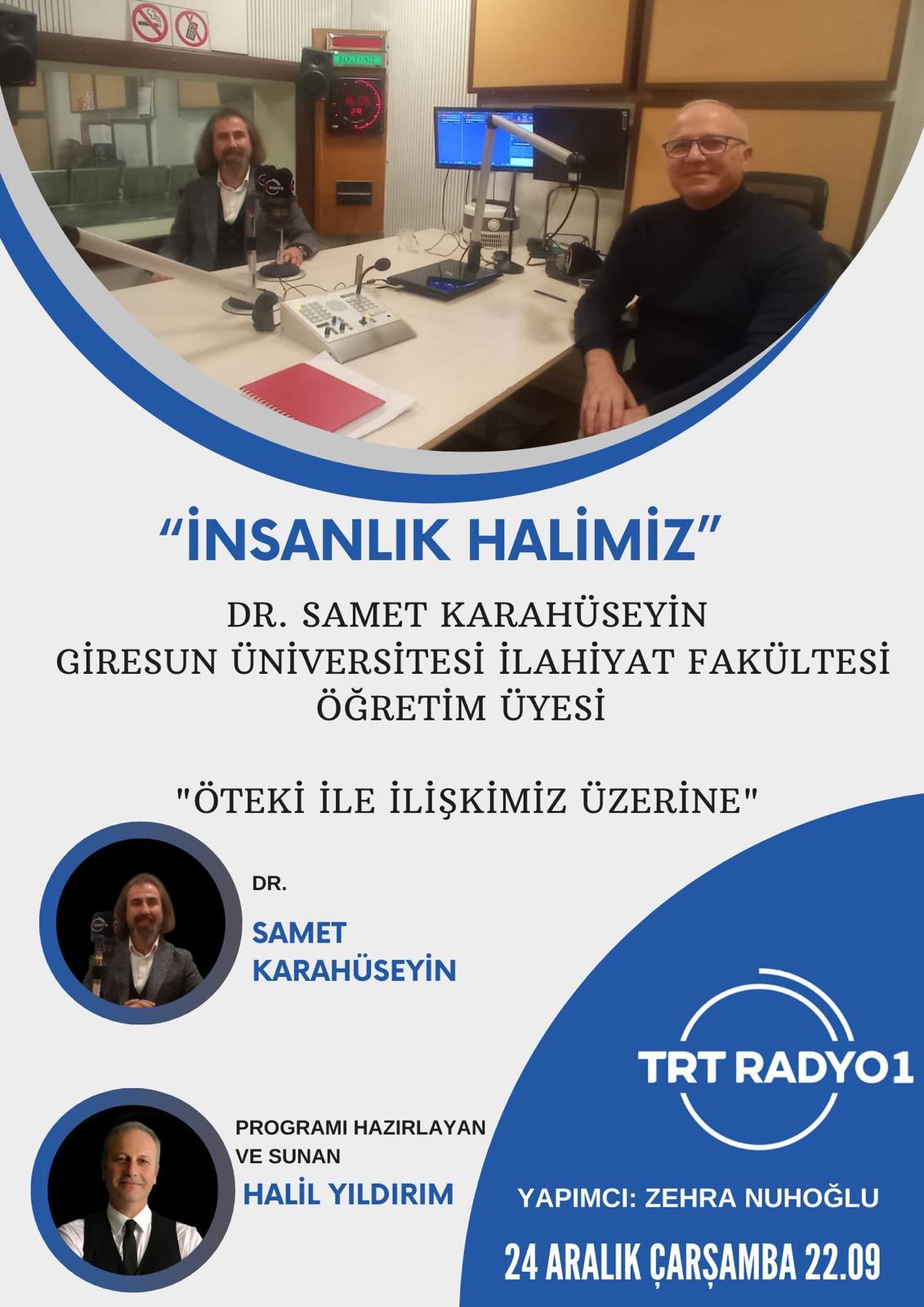 Fakültemiz Kelam Anabilim Dalı Dr. Öğr. Üyesi Samet KARAHÜSEYİN, 24 Aralık Çarşamba günü saat 22.09’da TRT Radyo 1’de yayınlanan “İnsanlık Halimiz” programına konuk oldu. Programda, “Öteki ile İlişkimiz / Öteki Düşüncesi Üzerine” başlığı altında insan ilişkileri, toplumsal algılar ve farklılıklarla bir arada yaşama kültürü ele alındı.
