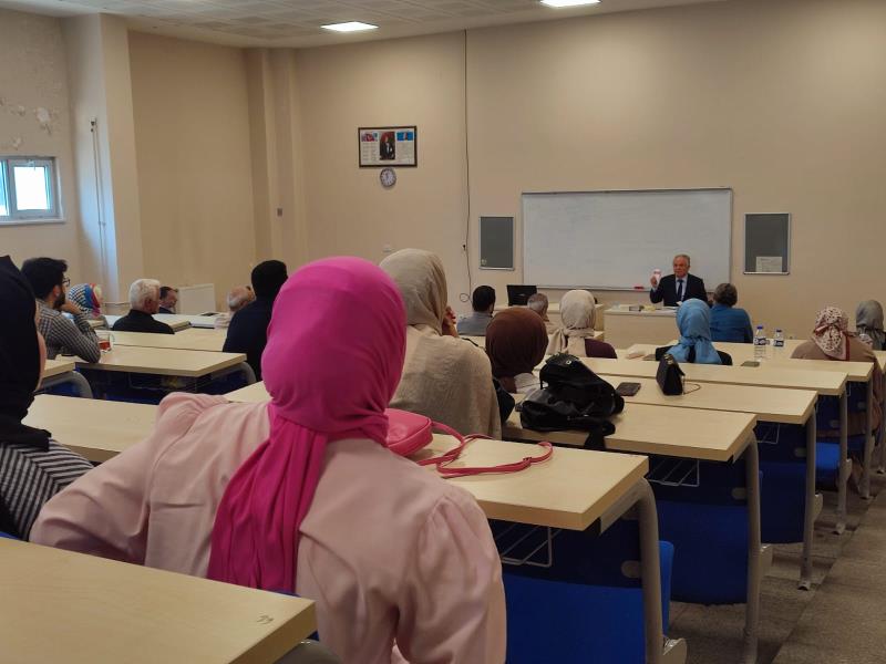 Prof. Dr. Hüseyin ERKUL, uzun yıllara dayanan akademik birikiminden ve devlet tecrübelerinden hareketle, devlet memurluğu kavramının anayasal ve yasal dayanaklarını detaylı biçimde ele aldı. Ayrıca kendi çalışmalarına ait özel notlarının yer aldığı defterinden bölümler paylaşarak, öğrencilere kamu görevliliği anlayışının temelini oluşturan ilkelere dair değerli bilgiler aktardı. Bu yönüyle etkinlik, hem teorik hem de uygulamalı bir tecrübe paylaşımı zemini sundu.