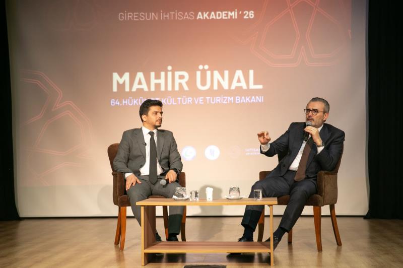 İhtisas Akademi Giresun programı kapsamında, 64. Hükümet Kültür ve Turizm Bakanı Mahir ÜNAL, 14 Nisan 2026 Salı günü Giresun Üniversitesi Şehit Ömer Halisdemir Konferans Salonu’nda gerçekleştirilen programda öğrencilerle ve katılımcılarla bir araya geldi.