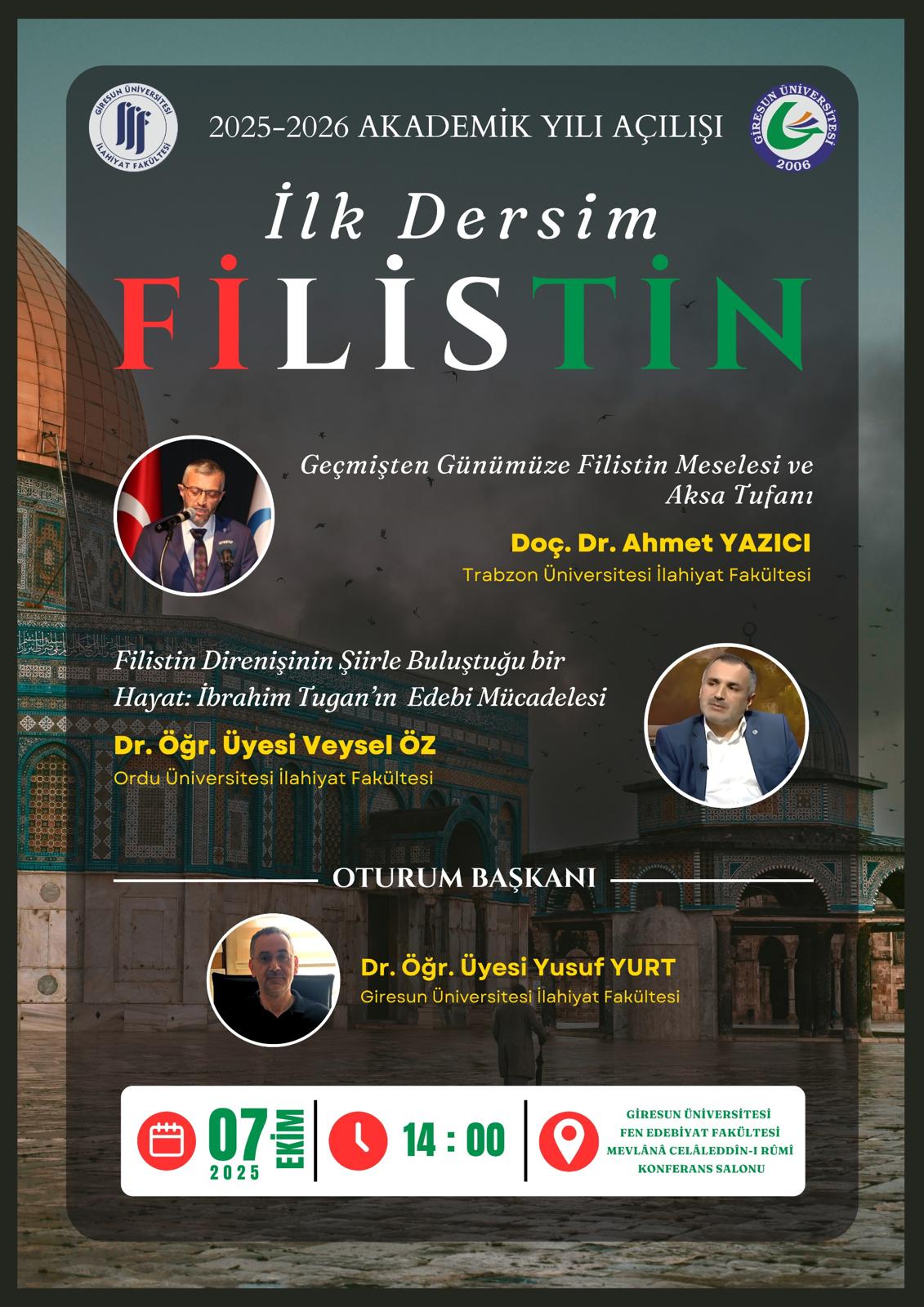 Giresun Üniversitesi İlahiyat Fakültesi tarafından 2025–2026 Akademik Yılı açılışı kapsamında “İlk Dersim Filistin” başlıklı bir program düzenlenecektir.
