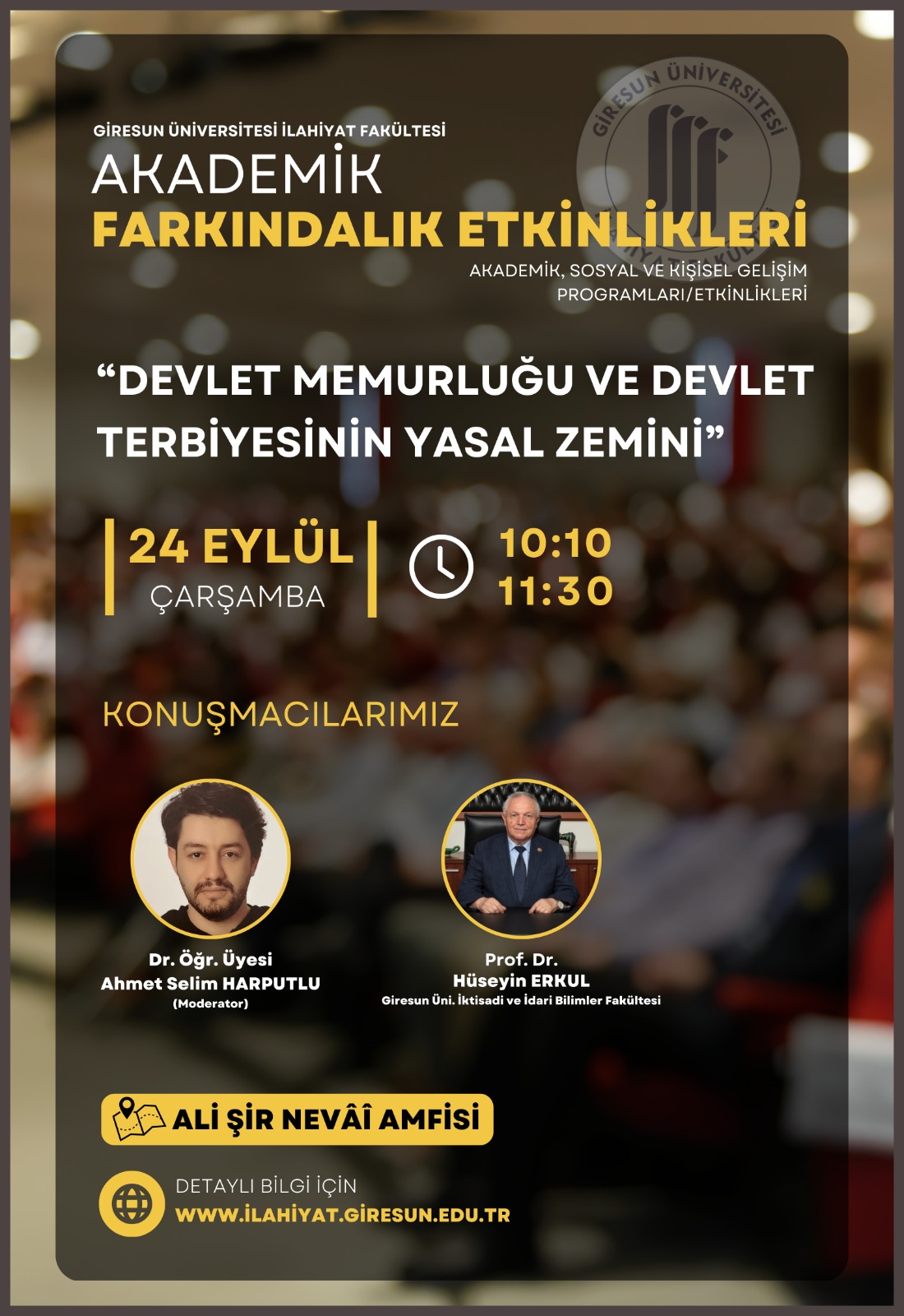 Giresun Üniversitesi İlahiyat Fakültesi tarafından düzenlenen Akademik Farkındalık Etkinlikleri kapsamında, kamu hizmetinin hukuki temelleri ve devlet terbiyesi konularının ele alınacağı bir konferans gerçekleştirilecektir.