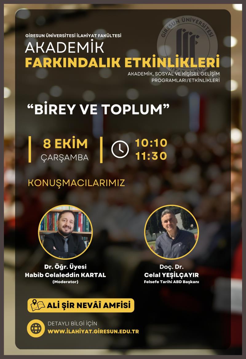 Giresun Üniversitesi İlahiyat Fakültesi tarafından düzenlenen Akademik Farkındalık Etkinlikleri kapsamında, “Birey ve Toplum” başlıklı program 8 Ekim 2025 Çarşamba günü gerçekleştirilecektir.