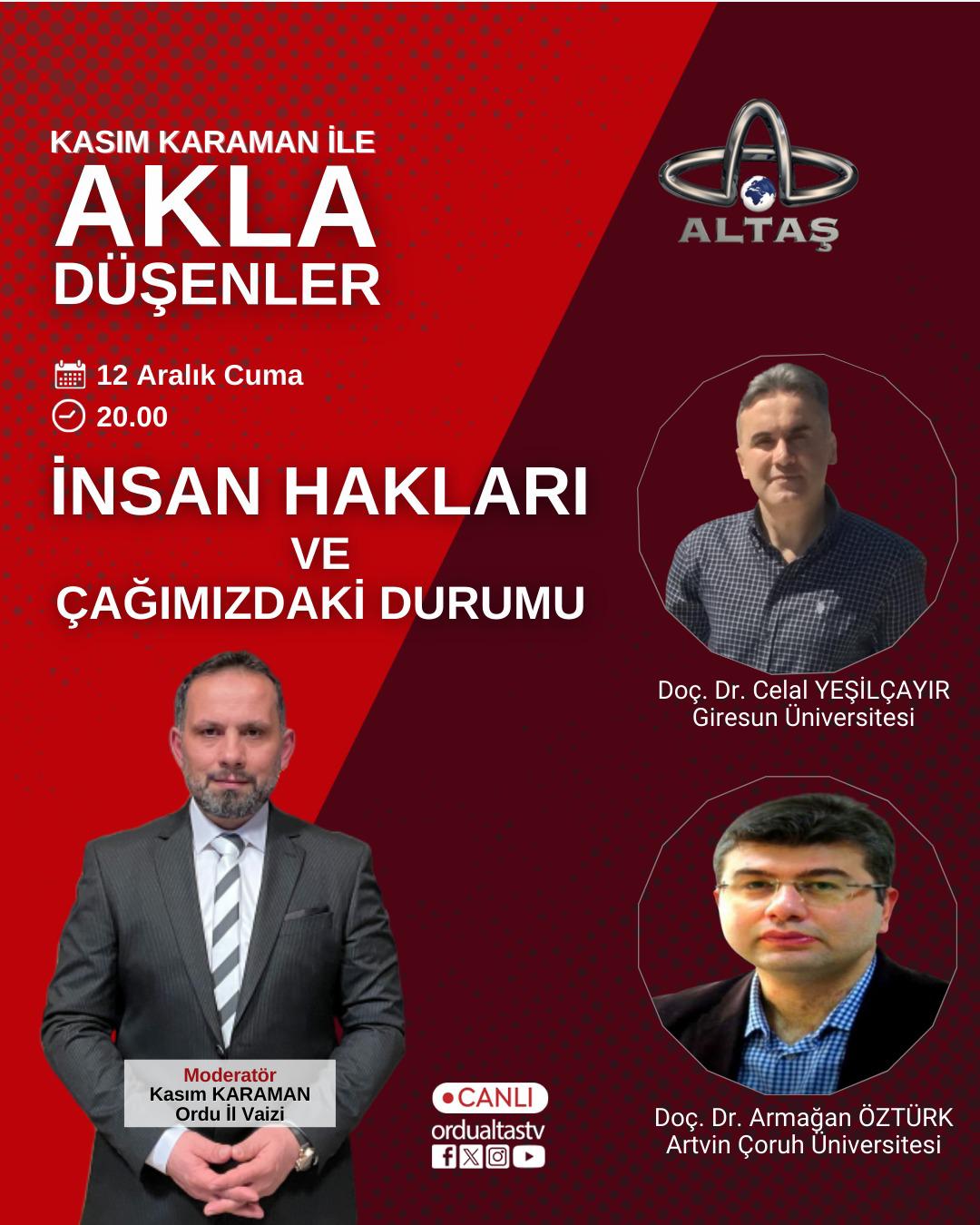 Fakültemiz öğretim üyesi Doç. Dr. Celal YEŞİLÇAYIR, 12 Aralık Cuma günü saat 20.00'de Altaş TV’de yayınlanan “Kasım Karaman ile Akla Düşenler” programına konuk olacaktır.