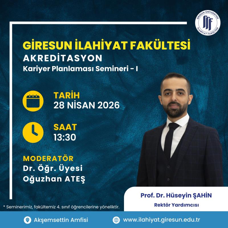 Giresun Üniversitesi İlahiyat Fakültesi Akreditasyon çalışmaları kapsamında, fakültemiz 4. sınıf öğrencilerine yönelik “Kariyer Planlaması Semineri-I” düzenlenecektir.