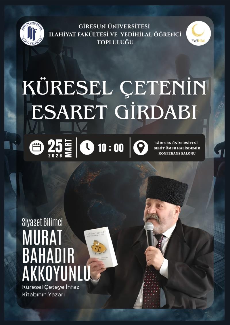 Giresun Üniversitesi İlahiyat Fakültesi ile Yedihilal Öğrenci Topluluğu iş birliğinde, siyaset bilimci ve Küresel Çeteye İnfaz kitabının yazarı Murat Bahadır AKKOYUNLU’nun konuşmacı olarak katılacağı “Küresel Çetenin Esaret Girdabı” başlıklı konferans düzenlenecektir.