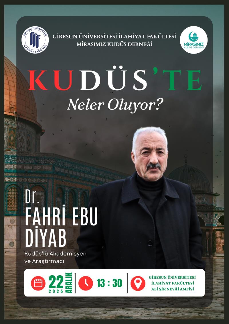 Bu kapsamda, Kudüs’te yaşanan güncel gelişmeleri yakından takip eden ve bölge üzerine çalışmalarıyla tanınan Kudüslü akademisyen ve araştırmacı Dr. Fahri Ebu DİYAB, fakültemizde bir konferans verecektir. Programda Kudüs’ün güncel durumu, bölgedeki siyasi-sosyal dönüşümler ve Mescid-i Aksâ’nın karşı karşıya olduğu riskler akademik bir çerçevede ele alınacaktır.
