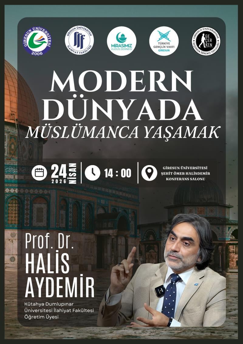Giresun Üniversitesi, Giresun Üniversitesi İlahiyat Fakültesi, Mirasımız Kudüs Derneği, Türkiye Gençlik Vakfı Giresun Temsilciliği ve Geçerken Öğrenci Topluluğu iş birliğiyle düzenlenecek olan “Modern Dünyada Müslümanca Yaşamak” konulu programda, Kütahya Dumlupınar Üniversitesi İlahiyat Fakültesi Öğretim Üyesi Prof. Dr. Halis AYDEMİR konuşmacı olarak yer alacaktır.