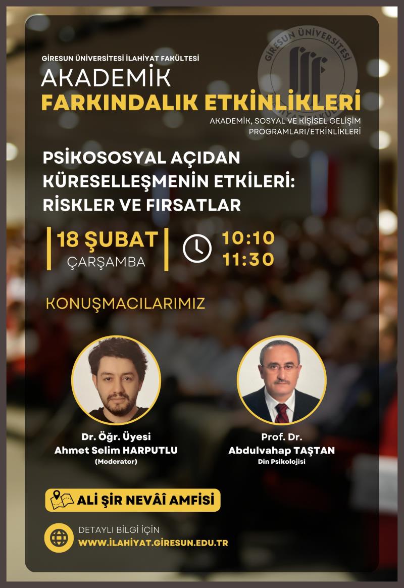 Programda, moderatörlüğünü Dr. Öğr. Üyesi Ahmet Selim HARPUTLU'nun üstleneceği oturumda, Prof. Dr. Abdulvahap TAŞTAN küreselleşmenin din psikolojisi bağlamındaki etkilerini değerlendirecektir. Küresel dönüşüm süreçlerinin bireysel kimlik, değer dünyası, aidiyet ve sosyal ilişkiler üzerindeki etkileri; ortaya çıkan risk alanları ve fırsatlar çerçevesinde analiz edilecektir.