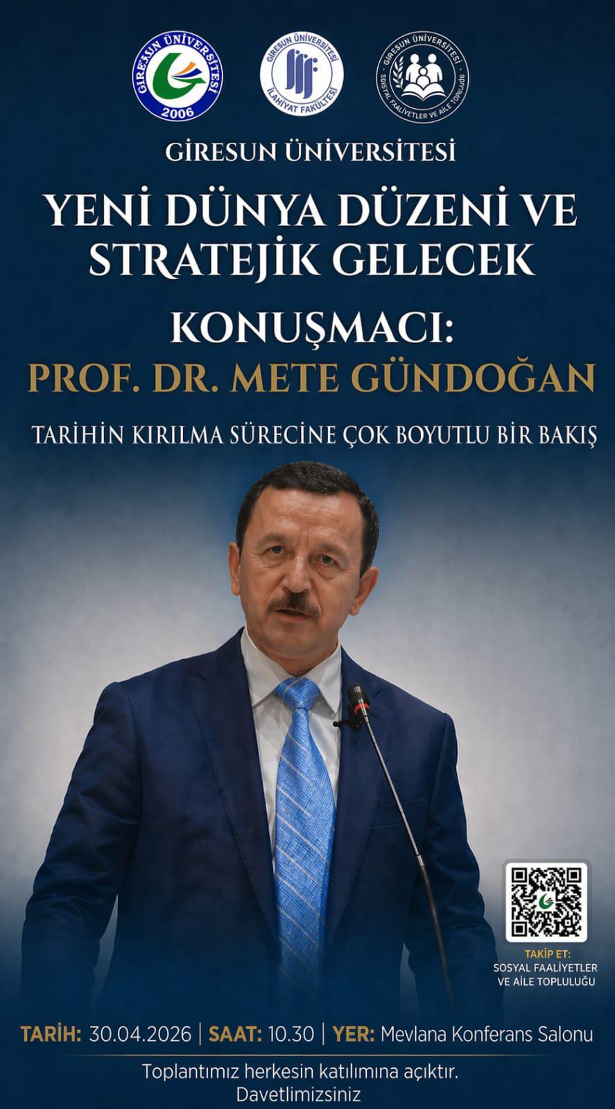 Giresun Üniversitesi İlahiyat Fakültesi ile Sosyal Faaliyetler ve Aile Topluluğu iş birliğinde, Prof. Dr. Mete GÜNDOĞAN’ın konuşmacı olarak katılacağı “Yeni Dünya Düzeni ve Stratejik Gelecek” başlıklı konferans düzenlenecektir.